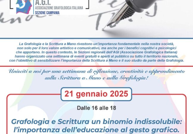 Le relatrici che hanno apportato il loro contributo all’evento sono state la dottoressa Filomena Ventre, docente di Grafologia e consulente e perito grafologo, la dottoressa Anna Rinaldi, Presidente AGI Campania, e la dottoressa Sabrina D’Alessio, educatore del gesto grafico. L’obiettivo dell’incontro è stato quello di sensibilizzare sull’importanza della scrittura a mano e sulla relazione tra questa e lo studio da parte della grafologia: la scrittura manuale, infatti, è parte essenziale della nostra vita ed è legata all’evoluzione psicomotoria dei bambini, i quali purtroppo non sono coadiuvati dalla vita quotidiana e dall’uso degli strumenti digitali a sviluppare i pre-requisiti per l’apprendimento della stessa.