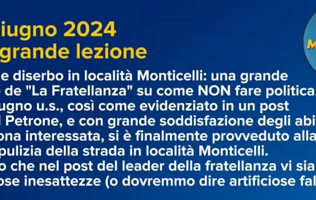 Pulizia e diserbo in località Monticelli: una grande lezione de “La Fratellanza” su come NON fare politica…