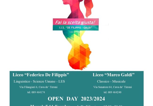 Scuola aperta oggi, mercoledì 14 dicembre, dalle ore 17 alle ore 20, nella sede De Filippis di via Filangieri, e venerdì 16, stesso orario, nella sede Galdi di via Senatore. Lo scopo è illustrare alle famiglie e ai giovani studenti delle scuole medie del territorio la ricca e diversificata offerta formativa del Liceo “De Filippis Galdi”.