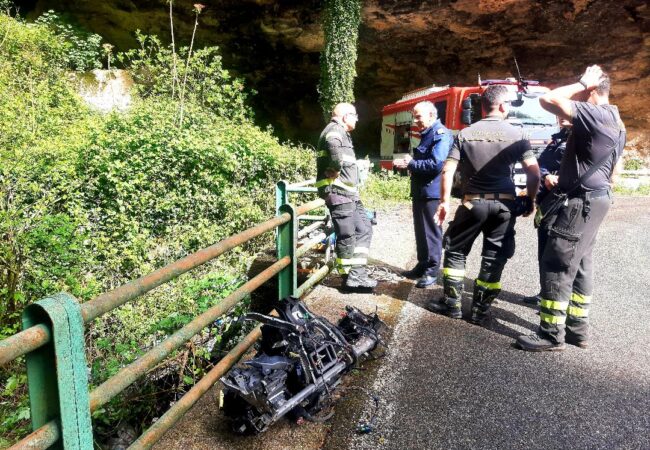 Questa mattina, grazie alla segnalazione di un cittadino alla Centrale Operativa del Commissariato di Polizia di Cava de’ Tirreni che ha allertato la Polizia Municipale, il luogotenente Domenico Tramontano e l’assistente capo Angela Bisogno si sono recati sulla Strada Provinciale 75- Avvocatella nel luogo indicato. “Siamo stati avvisati del ritrovamento di pezzi di auto e bombole di gas metano nei pressi delle grotte del Bonea”, hanno dichiarato i due membri della Polizia Locale che sono giunti sul posto insieme ai Vigili del Fuoco del distaccamento di Salerno Città che hanno rinvernuto numerosi pezzi di due diverse automobili nel vallone sottostante.