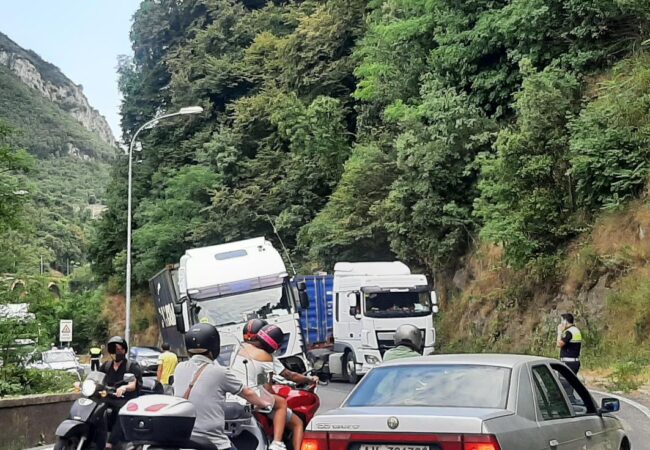 Traffico stradale bloccato oggi pomeriggio, poco prima delle 18:00 sull’ex strada statale 18 che collega Cava de’ Tirreni a Vietri sul Mare a causa di Un tir è rimasto bloccato in una curva. L’asse del mezzo pesante si è rotto all’improvviso e il camion si è inclinato sulla carreggiata, in mezzo al traffico.