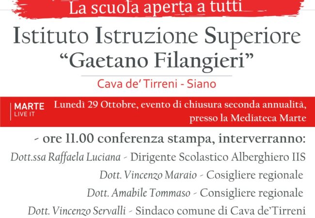 L’evento conclusivo dell’istituzione scolastica presieduta dalla prof.ssa Raffaela Luciano si terrà presso la Mediateca Marte di Cava de’ Tirreni, a partire adalle ore 11, con una conferenza stampa cui parteciperanno tra gli altri il sindaco di Cava de’ Tirreni Vincenzo Servalli, i consiglieri regionali Maraio ed Amabile, nonché il Direttore generale dell’Ufficio Scolastico Regionale della Campania Luisa Franzese.