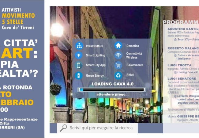 Si terrà, infatti, sabato 15 febbraio 2020 alle ore 10 presso il Salone delle Rappresentanze del Comune di Cava de’ Tirreni una tavola rotonda dal titolo “Una città smart: realtà o utopia?”. L’incontro avrà come oggetto l’idea di città smart (intelligente) e la possibilità di applicazione del modello anche alla nostra realtà territoriale.