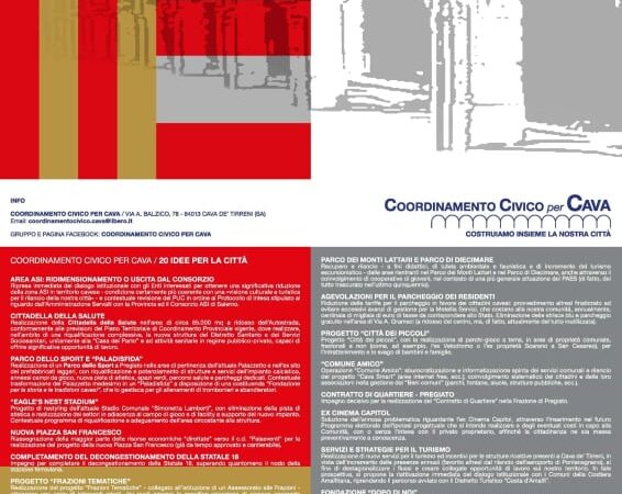 “Aprire una nuova stagione per Cava de’ Tirreni risulta quanto mai indispensabile e non più rinviabile – afferma la nota stampa del gruppo- tale consapevolezza ha ispirato le riflessioni che sono alla base di queste proposte (tutte, riteniamo, caratterizzate da concretezza e fattibilità economica)”.