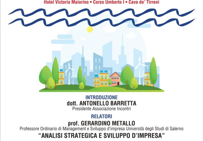 Il convegno, organizzato dall’Associzione politico-culturale Incontri in collaborazione con il nostro giornale, sarà introdotto dal dottore Antonello Barretta, presidente del sodalizio, mentre i relatori saranno il professore Gerardino Metallo, ordinario di Management e Sviluppo d’IMpresa dell’Università di Salerno, e l’ingegnere Armando Zambrano, presidente del Consiglio Nazionale Ingegneri.