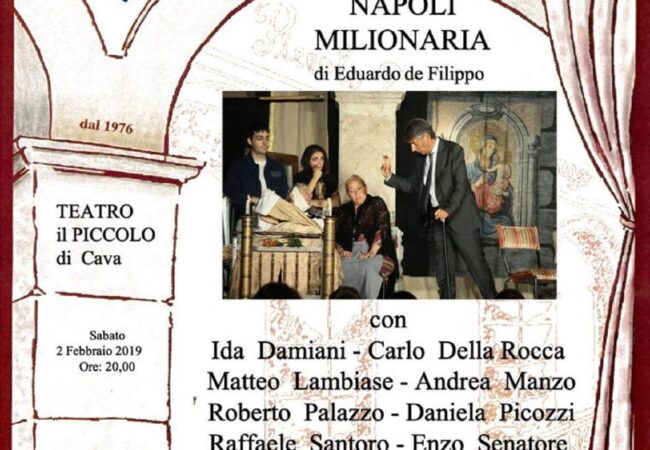 Sabato prossimo 2 febbraio, dalle 20.00, e la successiva domenica 3 febbraio, dalle 18.00, torna a Cava de’ Tirreni la Stagione Teatrale targata Arcoscenico e Piccolo Teatro al Borgo, con il quinto appuntamento al Teatro Il Piccolo di Cava, in piazza V. Emanuele II. In scena il Piccolo Teatro al Borgo diretto dal maestro Mimmo Venditti, con «NAPOLI MILIONARIA!».