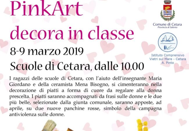 Con tali obiettivi l’Amministrazione comunale di Cetara, propone l’iniziativa “PinkArt-decora in classe”, un progetto che coinvolge la V elementare e le classi della scuola media dell’Istituto comprensorio “Pinto” di Cetara, nei giorni 8-9 marzo, durante l’ora d’arte, a partire dalle 10.