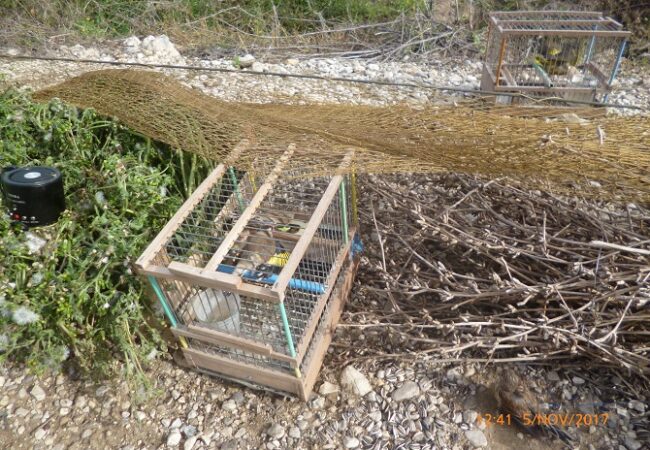 Nei pressi della rete sono state trovate otto gabbie con all’interno un Verdone, un Cardellino, un Verzellino, due Frosoni, due Fanelli e due Luccherini, utilizzati come richiami vivi.