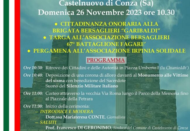 Una cerimonia di alto valore istituzionale, voluta dal sindaco del comune di Castelnuovo di Conza, Francesco Di Geronimo, in collaborazione e con il patrocinio dell’Ente Provincia di Salerno, che vedrà la presenza tra le più alte cariche civili e militari del territorio regionale e del Mezzogiorno, nella quale il Comune di Castelnuovo di Conza conferirà la cittadinanza onoraria alla Brigata Bersaglieri “Garibaldi” di Caserta, una targa all’Associazione Bersaglieri “67° Fagarè” e all’Associazione “Irpinia Solidale”.