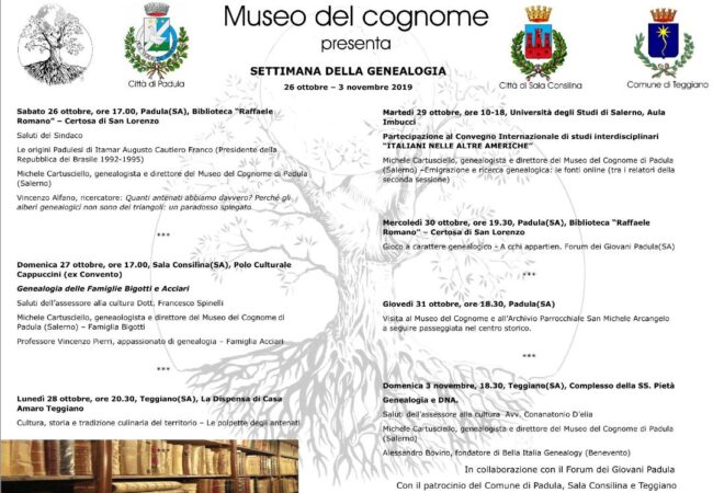 In occasione del mese dedicato alla storia di famiglia, Michele Cartusciello, direttore del Museo del Cognome di Padula, con la collaborazione del Forum dei Giovani di Padula e il patrocinio dei Comuni di Padula, Sala Consilina e Teggiano, organizza la “Settimana della Genealogia” che si tiene dal 26 ottobre al 3 novembre.