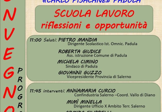 “Scuola – Lavoro: riflessioni e opportunità” è il tema del convegno, organizzato dal Liceo Scientifico “Pisacane” di Padula, in programma giovedì 26 gennaio alle ore 11.00 presso la Sala del Refettorio della Certosa di San Lorenzo a Padula.