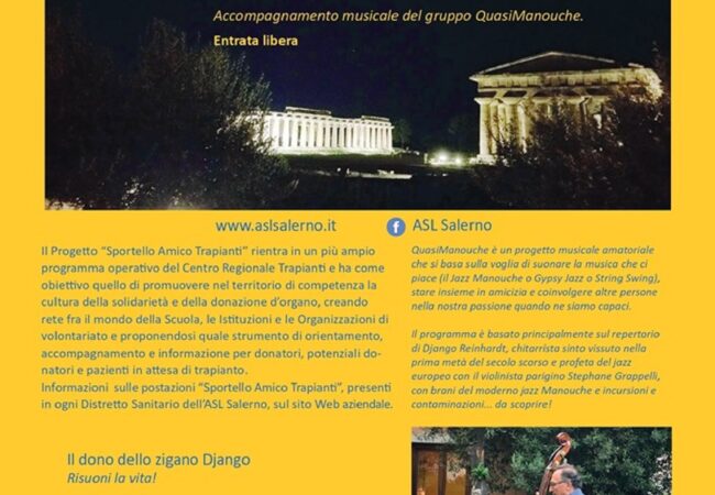Durante l’evento saranno distribuite, a cura del Comune di Capaccio–Paestum, delle piantine grasse e del materiale informativo allo scopo di sensibilizzare i turisti e tutti i presenti sul tema della donazione degli organi; dalle ore 18:00 alle ore 19:30 ci sarà l’esibizione del gruppo musicale “QuasiManouche”, di cui fa parte il dottor Fernando Chiumiento, Direttore del Dipartimento Area Critica dell’Asl Salerno. Il programma musicale è dedicato al repertorio del grande Django Reinhardt, chitarrista vissuto nella prima metà del secolo scorso.