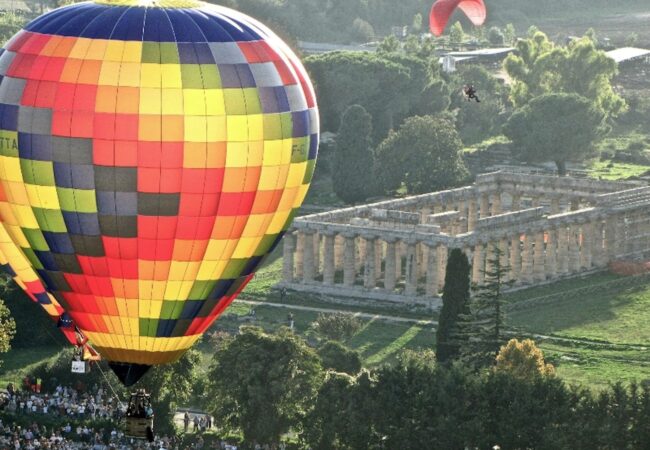 Il Festival Internazionale delle Mongolfiere è una manifestazione dedicata al volo in aerostato, organizzata in uno scenario reso straordinario dalla vicinanza dei templi di Paestum, al di sopra dei quali si vola, con una vista mozzafiato: per questo la manifestazione si è attestata tra i cinque festival internazionali della mongolfiera più suggestivi del mondo. Ogni anno l’evento attira migliaia di visitatori, molti dei quali stranieri, con un trend in continua crescita: le fotografie scattate dalla mongolfiera diventano vere e proprie cartoline che raccontano dall’alto l’area archeologica abbinando la conoscenza del territorio all’emozione del volo.