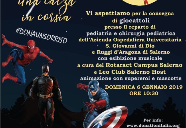 Anche quest’anno nel tradizionale giorno dell’Epifania, lunedì 6 gennaio alle ore 10.00, Donation Italia promuove con una rete di associazioni salernitane e studentesche la campagna di volontariato e solidarietà intitolata “Arriva la Befana, un giocattolo in pediatria”.