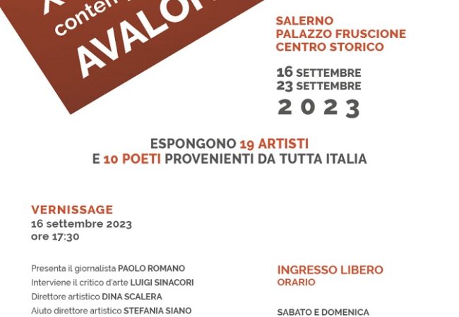 Dal 16 al 23 settembre si terrà la X edizione dell’Expo d’Arte Contemporanea e poesia “Avalon in Arte”, organizzata dall’Associazione Culturale “Avalon Arte APS” di Salerno. L’esposizione, patrocinata dal Comune di Salerno, si svolge presso Palazzo Fruscione – Vicolo Adelberga (ad. Via Dei Canali) nel cuore del centro storico.