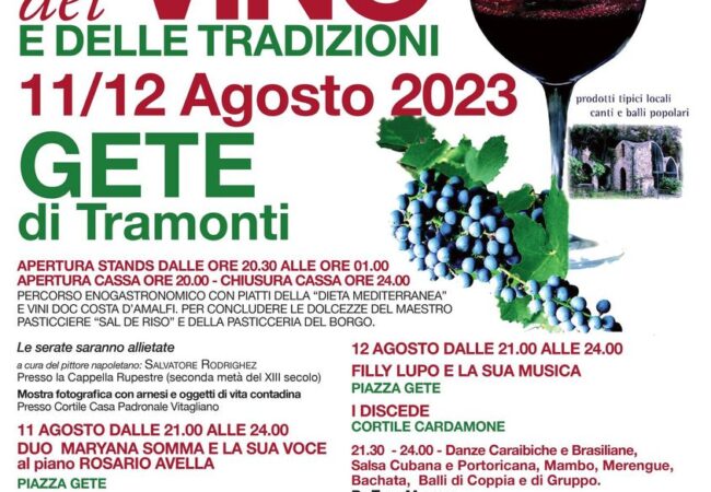 L’11 e il 12 agosto 2023, si terrà la trentaduesima festa del Vino e delle tradizioni a Gete, una delle tredici frazioni di Tramonti, il polmone verde della Costiera Amalfitana.