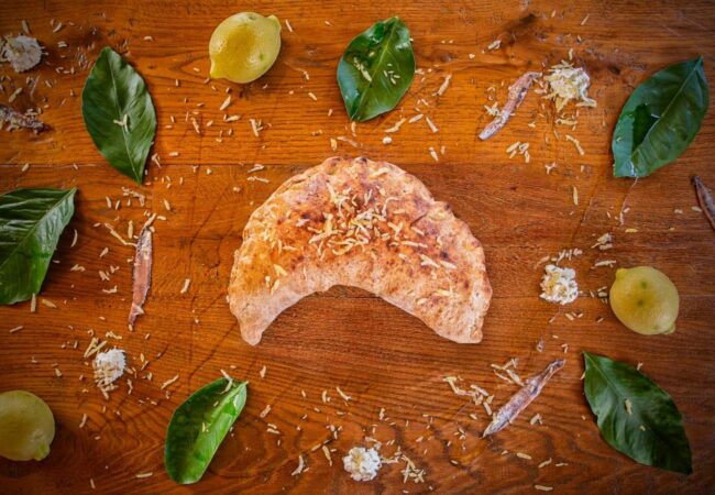 Da una parte, la Pizza Tramonti Regina Margherita, una marinara con un impasto a base di farina integrale macinata a pietra, speziata al finocchietto selvatico e arricchita da provola affumicata, origano, basilico e Olio EVO delle Colline Salernitane; dall’altra, il calzone “L’Oro della Costa”, che condivide l’impasto integrale della Regina Margherita, condito con ricotta, Fior di Latte, noci e zest di limone.