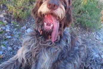 Frida indossa un collare in nylon nero ed è facilmente riconoscibile per la sua andatura incerta dovuta a artrosi alle zampe posteriori