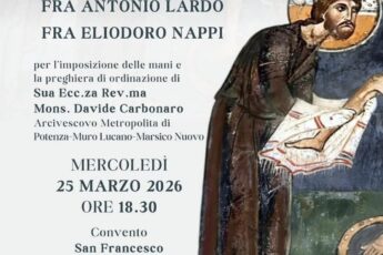 Mercoledì 25 marzo, alle ore 18.30, presso il Convento di San Francesco e Sant’Antonio, la comunità di Cava de’ Tirreni accoglierà con gioia l’ordinazione diaconale di Fra Antonio Lardo e Fra Eliodoro Nappi. La celebrazione sarà presieduta da Mons. Davide Carbonaro, Arcivescovo Metropolita di Potenza-Muro Lucano-Marsico Nuovo