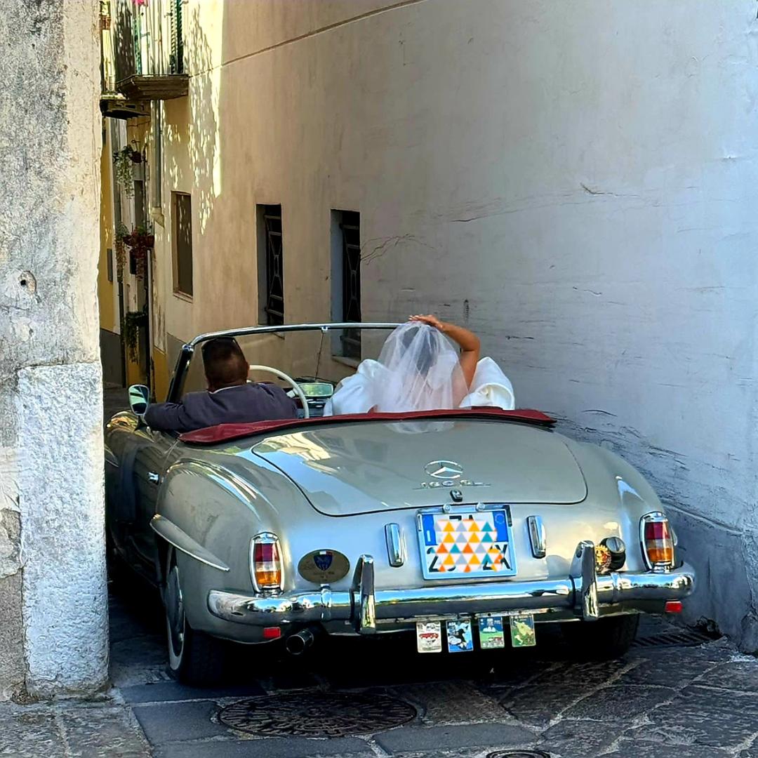 Dopo la cerimonia religiosa nell’Abbazia della SS. Trinità, fondata nel 1011 da Sant’Alferio Pappacarbone e cuore storico e simbolico della città di Cava, i neo sposi si sono spostati in Costiera Amalfitana, ai Giardini del Fuenti, per dare vita ai festeggiamenti con parenti e amici, ma prima hanno effettuato una sosta di relax e di preparazione all’ Hotel Scapolatiello, storico albergo ubicato nel cuore del verdeggiante e antichissimo borgo del Corpo di Cava da cui, attorno all’Abbazia, a partire dall’anno mille, iniziò a prendere forma il primo nucleo abitato della città di Cava. Nelle confortevoli e spaziose camere dell’hotel Benji e la bellissima consorte, contornati da un nutrito entourage e da una stretta sicurezza, hanno indossato i loro sfavillanti abiti e si sono sottoposti alle sapienti cure di estetisti e parrucchieri prima di partire alla volta della Costiera Amalfitana a bordo di una sfolgorante Mercedes cabrio d’epoca.