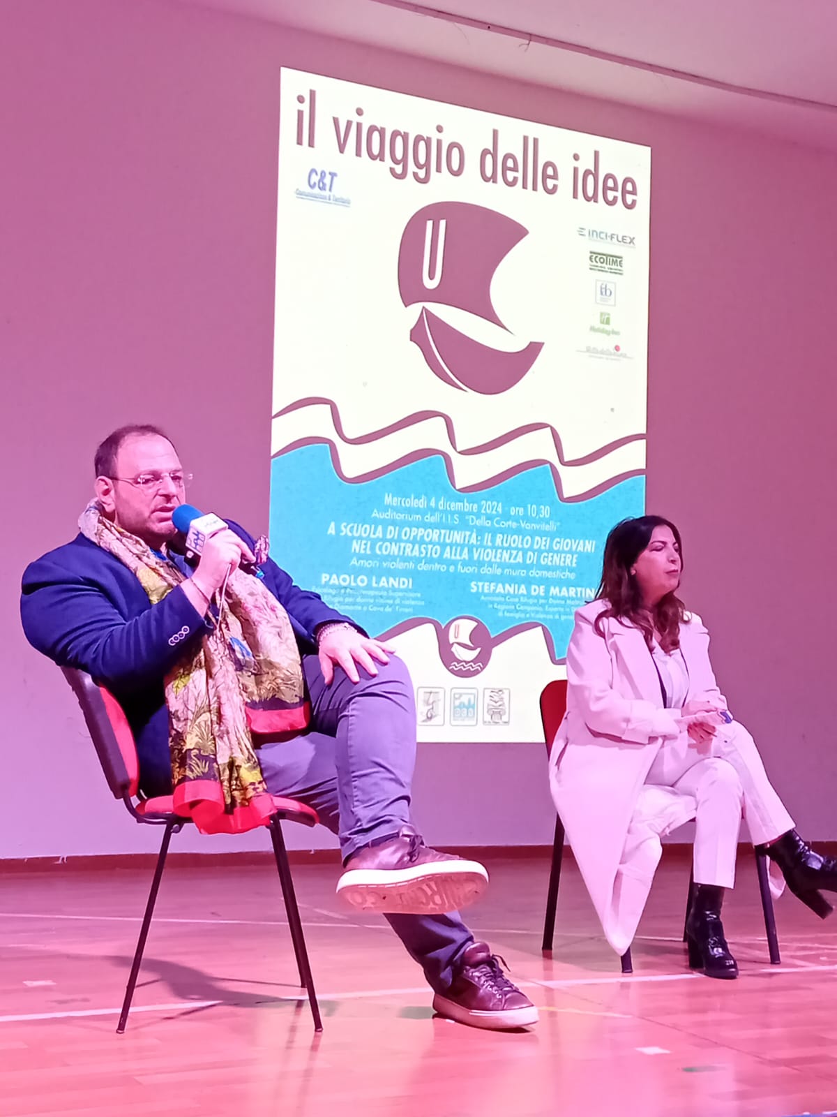 Il quinto e ultimo appuntamento della quinta edizione de Il Viaggio delle Idee, che si è tenuto ieri mattina presso l’Auditorium dell’I.I.S “Della Corte – Vanvitelli”, ha avuto come protagonisti il dott. Paolo Landi, Psicologo e Psicoterapeuta Supervisore Casa Rifugio per donne vittime di violenza Luna Diamante a Cava de’ Tirreni, e l’avv. Stefania De Martino, avvocata Case Rifugio per Donne Maltrattate in Regione Campania, Esperta in Diritto di famiglia e Violenza di genere, sul tema A scuola di opportunità: il ruolo dei giovani nel contrasto alla violenza di genere: Amori violenti dentro e fuori dalle mura domestiche.