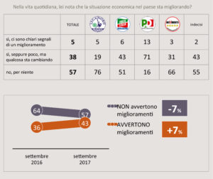 Dal campione degli italiani intervistati emerge che il pessimismo è sceso di 7 punti percentuali, al contrario cresce l’ottimismo con il 43% degli italiani che avverte sintomi di ripresa economica (erano il 38% nel settembre 2016).