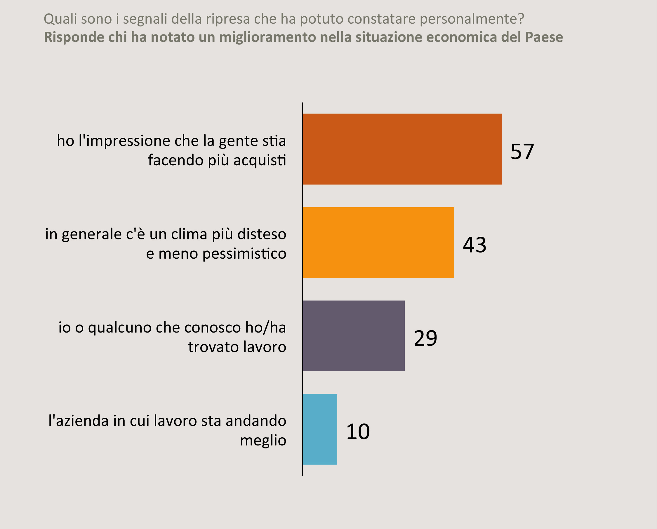 “I segnali di ripresa economica si iniziano ad avvertire e coinvolgono anche il quadro occupazionale. A certificare il movimento positivo, questa volta -scrivono gli analisti di SWG- non è l’andamento del Pil o le valutazioni dei vari centri economici internazionali, ma la percezione diretta e quotidiana degli italiani”.
