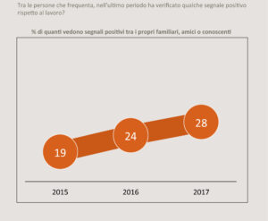 “A sostenere e rafforzare il senso di miglioramento dell’economia -evidenziano i ricercatori di SWG- c’è anche la sensazione di un cambio di passo sul fronte occupazionale. Nel 2015 solo il 19% degli italiani affermava di conoscere persone che avevano trovato lavoro; oggi, questa quota è balzata in avanti di 9 percentuali, portando la media al 28%”.