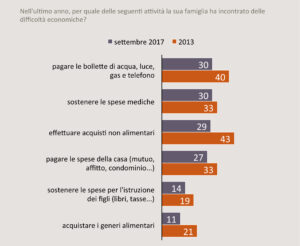 “Se passiamo dai dati di pura percezione, al quadro del vissuto delle famiglie -proseguono- il miglioramento del trend economico è ancora più evidente. Rispetto al 2013 il numero delle famiglie in difficoltà è in decisa discesa. I nuclei familiari che stentano a pagare le bollette di luce, acqua e gas sono in netto calo (-10%) e sono passa dal 40% del 2013 al 30% di oggi. Ancora più evidente (-14%) è la diminuzione della quota di famiglie costrette a fare rinunce sugli acquisti non alimentari”.