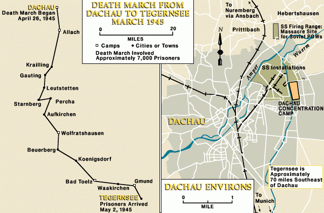 Sam Itzkowitz, che sopravvisse a una marcia della morte da Landsberg, disse che il suo gruppo viaggiò quasi due settimane nella neve, e che i prigionieri dormivano nelle strade, all’aperto, come animali, mentre sui cieli sopra di loro si sentivano aerei e rumori di bombardamenti ovunque.