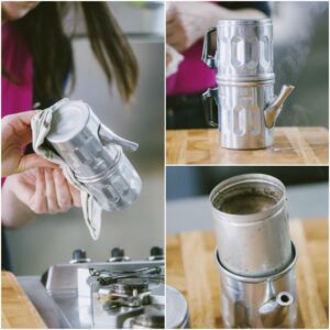 Tenere tutti i pezzi, compresi stracci da cucina e presine, a portata di mano, riempire di caffè il serbatoio, non schiacciare il caffè, avvitare il filtro, riempire d’acqua l’altro serbatoio, avvitare filtro e serbatoio, mettere la macchinetta sulla fiamma, capovolgerla, così l’acqua calda sottostante passerà attraverso il caffè filtrandolo e raccogliendosi nel serbatoio con il beccuccio; il caffè va servito bollente direttamente dal beccuccio della macchinetta, dando così al rito una nota retrò.