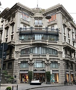 Il prospetto ad angolo si articola sui vari livelli con ampie bucature, verande, balaustre e terrazzi, il tutto sovrastato da una cupola semi poligonale.