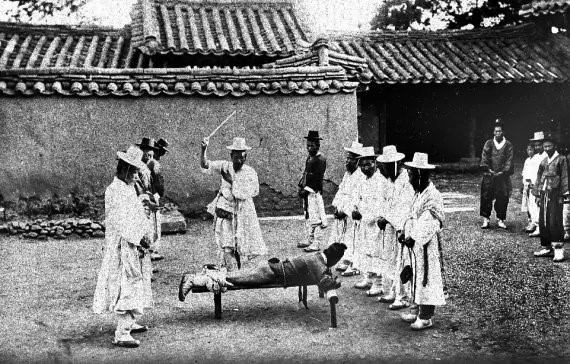Flagellazione in Corea agli inizi del 1900: spesso la tortura diventa un rituale pubblico per scoraggiare ogni trasgressione.