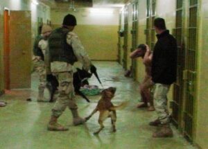 Un prigioniero iracheno minacciato da cani dell’esercito Usa nel carcere di Abu Ghraib nel 2005.