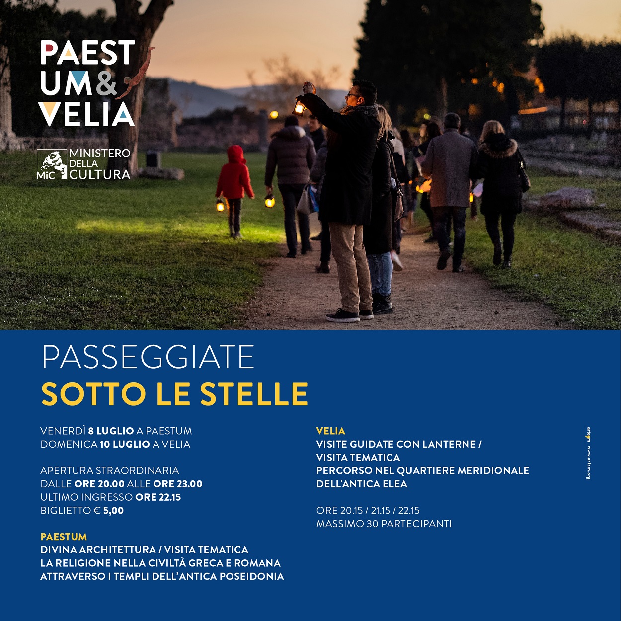 Si parte venerdì 8 luglio a Paestum e domenica 10 luglio a Velia con apertura delle due aree archeologiche dalle ore 20:00 alle ore 23:00 e biglietto di ingresso by night a € 5,00.