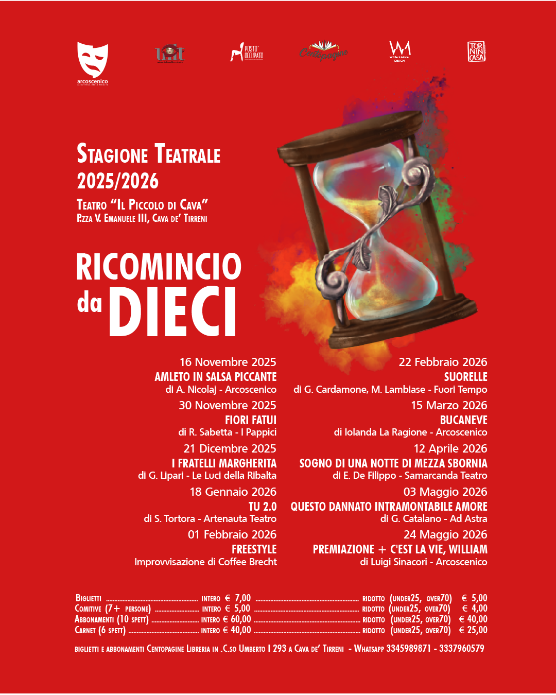 Domenica 16 novembre, al teatro Il Piccolo di Cava in Piazza Vittorio Emanuele III a Cava de’ Tirreni, riparte la Stagione teatrale organizzata dall’Associazione Arcoscenico.