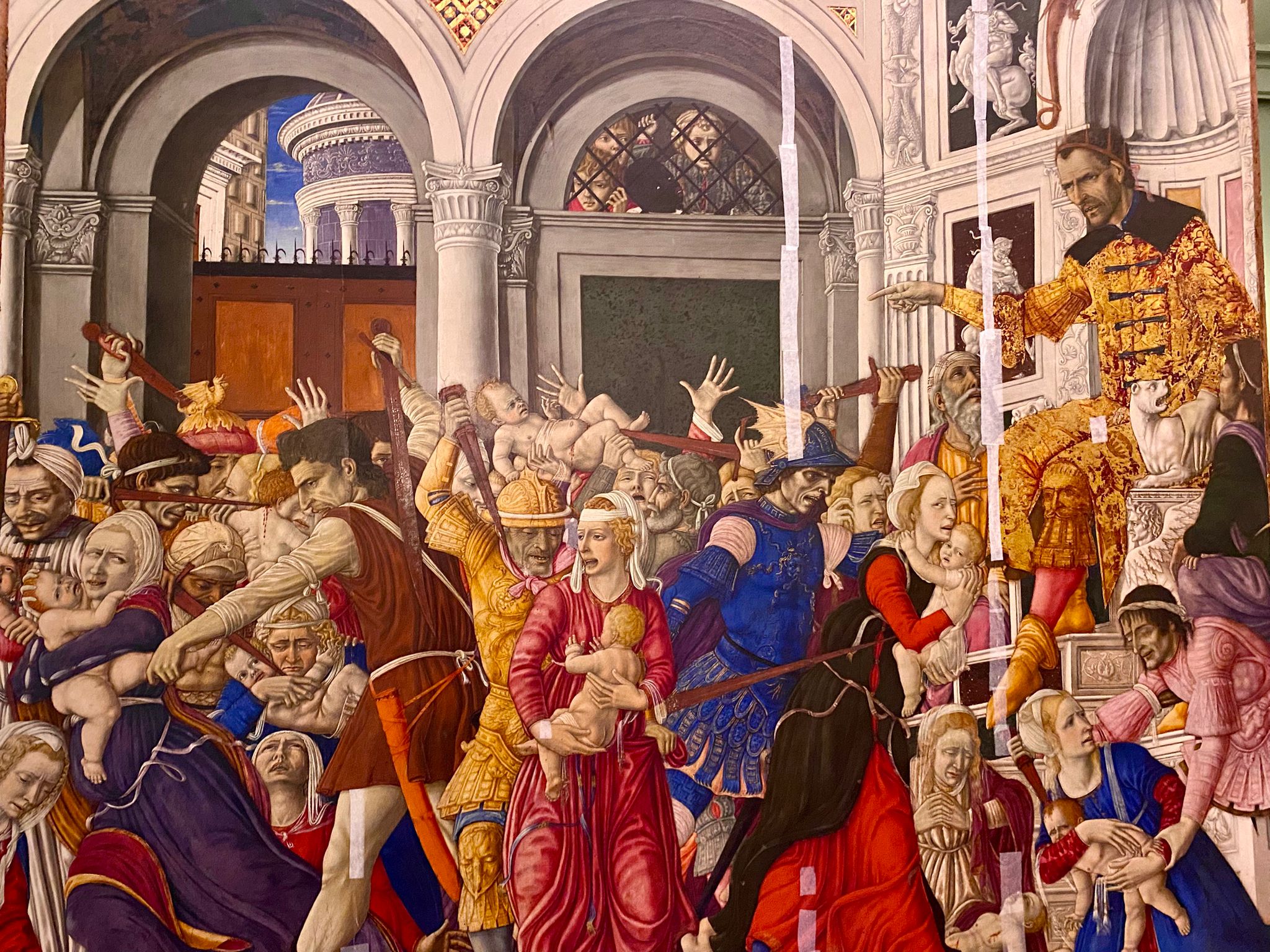 Prima ad arrivare, La Strage degli Innocenti di Matteo di Giovanni (Borgo San Sepolcro 1430 ca. – Siena 1495 ca.). Si tratta di una tempera emulsionata su tavola del 1488 ca., realizzata forse a Siena su committenza di Alfonso d’Aragona duca di Calabria durante la campagna antimedicea. Probabilmente commemora la strage dei turchi ai danni degli abitanti di Otranto nel luglio 1480. Le loro reliquie per volontà di Alfonso furono traslate a Napoli, insieme al dipinto, nella chiesa di Santa Caterina a Formiello, a Napoli.