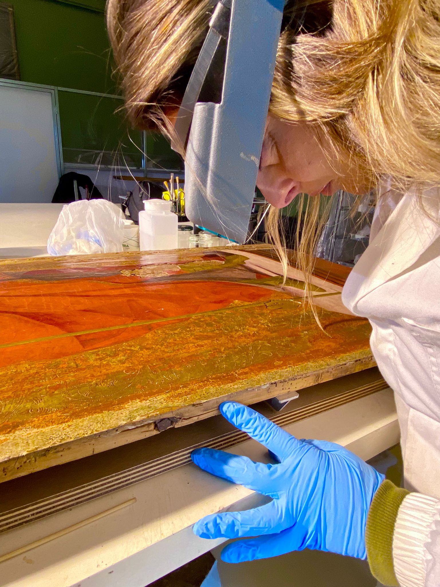 Un dipinto su tavola è costituito infatti dalla stratificazione di materiali eterogenei, legno, preparazione, legante pigmento che, a causa della minima variazione di temperatura e umidità, subiscono delle modifiche dimensionali che vanno a incidere sulla parte più delicata, la pellicola pittorica, sotto forma di sollevamenti e lesioni. Scopo degli interventi è il controllo di questi fenomeni, con l’installazione o adeguamento della cosiddetta parchettatura ovvero una intelaiatura elastica capace sia di sostenere che di assecondare i suddetti movimenti naturali della materia. I lavori interessano poi la superficie dipinta, con la pulitura e l’integrazione pittorica che consentiranno di recuperare la brillantezza delle cromie originali. L’utilizzo delle sale come laboratori e l’adozione di una schermatura trasparente offre il vantaggio di rendere visibili le operazioni di restauro, condividendo l’esperienza con i visitatori che potranno osservare l’avanzamento del processo, condividerne il necessario approccio scientifico, apprendere le tecniche costruttive originarie e i progressi della moderna scienza della conservazione.