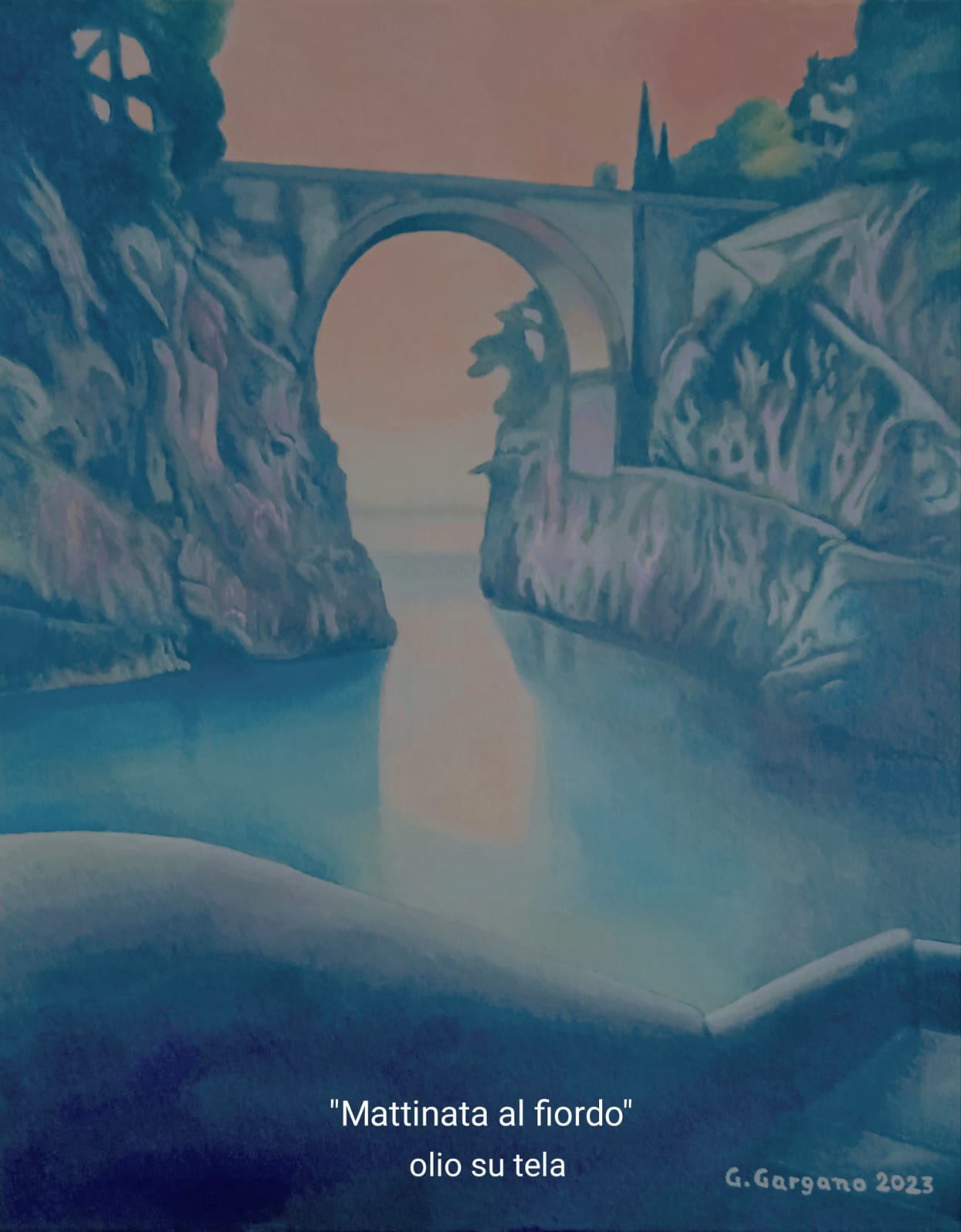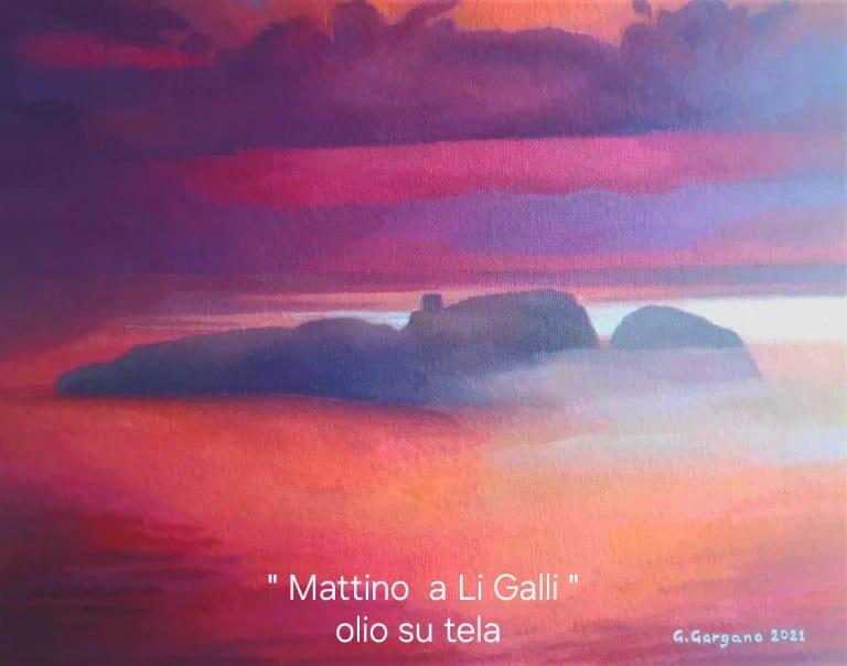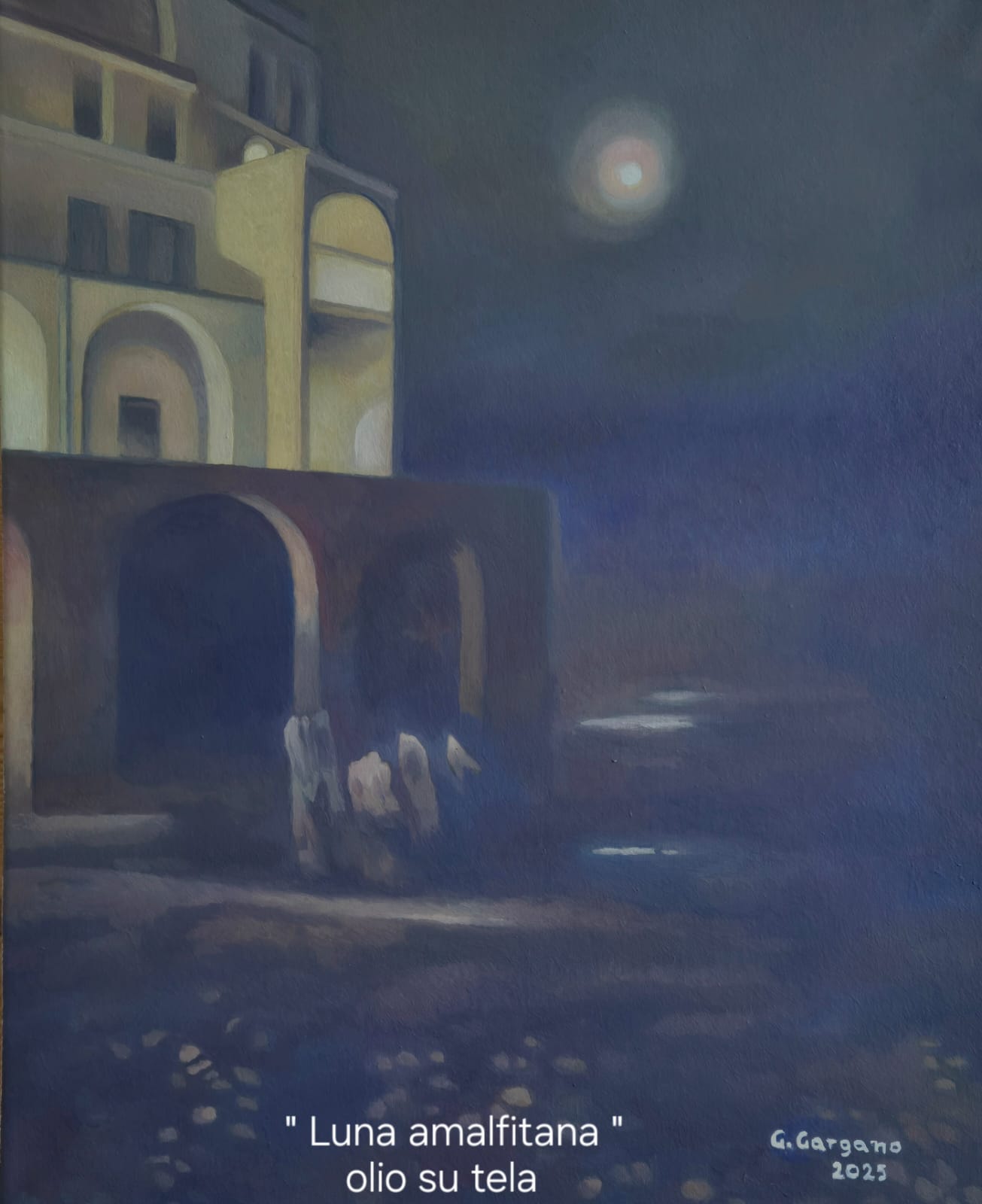 Di Giovanni Gargano abbiamo una conoscenza antica che ci ha portato ad apprezzarlo nel corso degli anni. La Mostra collettiva che si tiene per tutta l’estate nella elegante Galleria ravellese, rappresenta un’ulteriore conferma delle qualità della sua pittura alla ricerca degli spazi infiniti, dove gli oggetti, si perdono tra il cielo e la terra. Le opere esposte nella Collettiva 2025, riportano il visitatore in un’atmosfera rarefatta, quasi onirica, soprattutto in alcune opere come “Mattino a Li Galli” (olio su tela (2021), La magia dell’isola” o anche “Notte di luna piena” olio su tela del 2025; oppure uno splendido scorcio di Amalfi dal titolo “Luna amalfitana”, che sembra rievoca atmosfere oniriche forse mutuate dalla pittura di De Chirico.