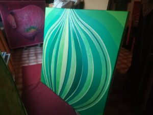 Percorrendo lo stretto e lungo corridoio dell’atelier, ci siamo poi soffermati dinanzi ad altre tele che Intignano ci ha spiegato essere quadri astratti. La prima opera è nata per puro caso. ”Stavo preparando una mostra estemporanea – ci ha raccontato andando indietro sull’onda dei ricordi – il quadro si intitola “Positano di sera” con le prime luci che illuminano le case. Io stavo accingendomi a dipingere in maniera realistica, ma poi nel fare è venuto fuori questo altro stile”.