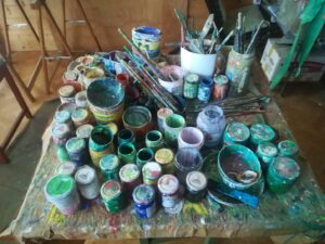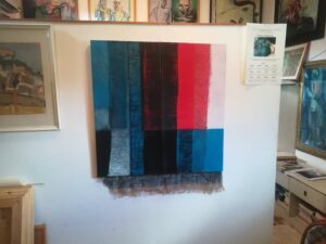 E’ un artista poliedrico Intignano, che utilizza vari tipi di materia per dare vita alle sue opere. Abbiamo potuto ammirare questa sua vena in alcune tele che uniscono ai colori altri materiali, come sughero, sacchi di juta e persino vecchie tovaglie dismesse e tubetti di colore, conglomerandoli nel lavoro finito.