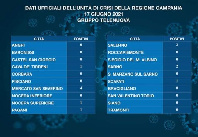 E’ quanto si rileva dal report ufficiale comunicato dall’Unità di crisi della Regione Campania, pubblicato in un post sulla propria pagina Facebook dalla emittente televisiva Telenuova di Pagani.