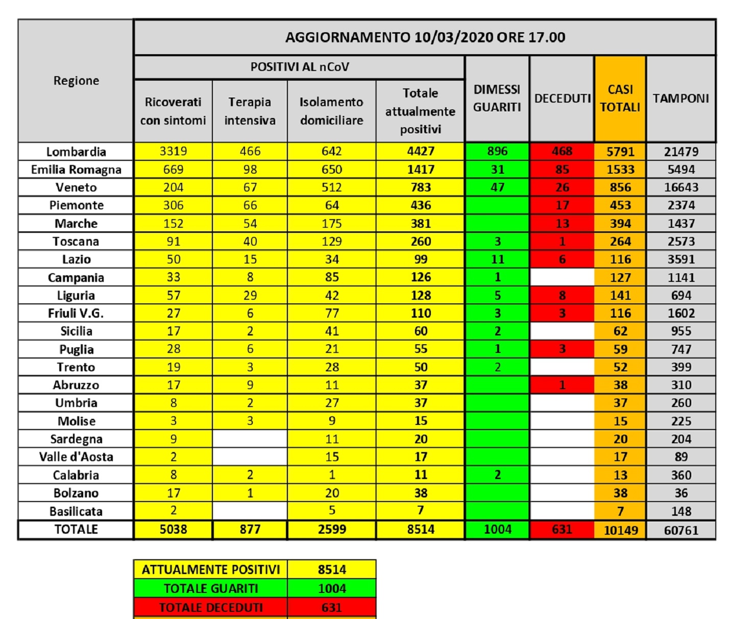 I deceduti sono 631, questo numero, però, potrà essere confermato solo dopo che l’Istituto Superiore di Sanità avrà stabilito la causa effettiva del decesso.
