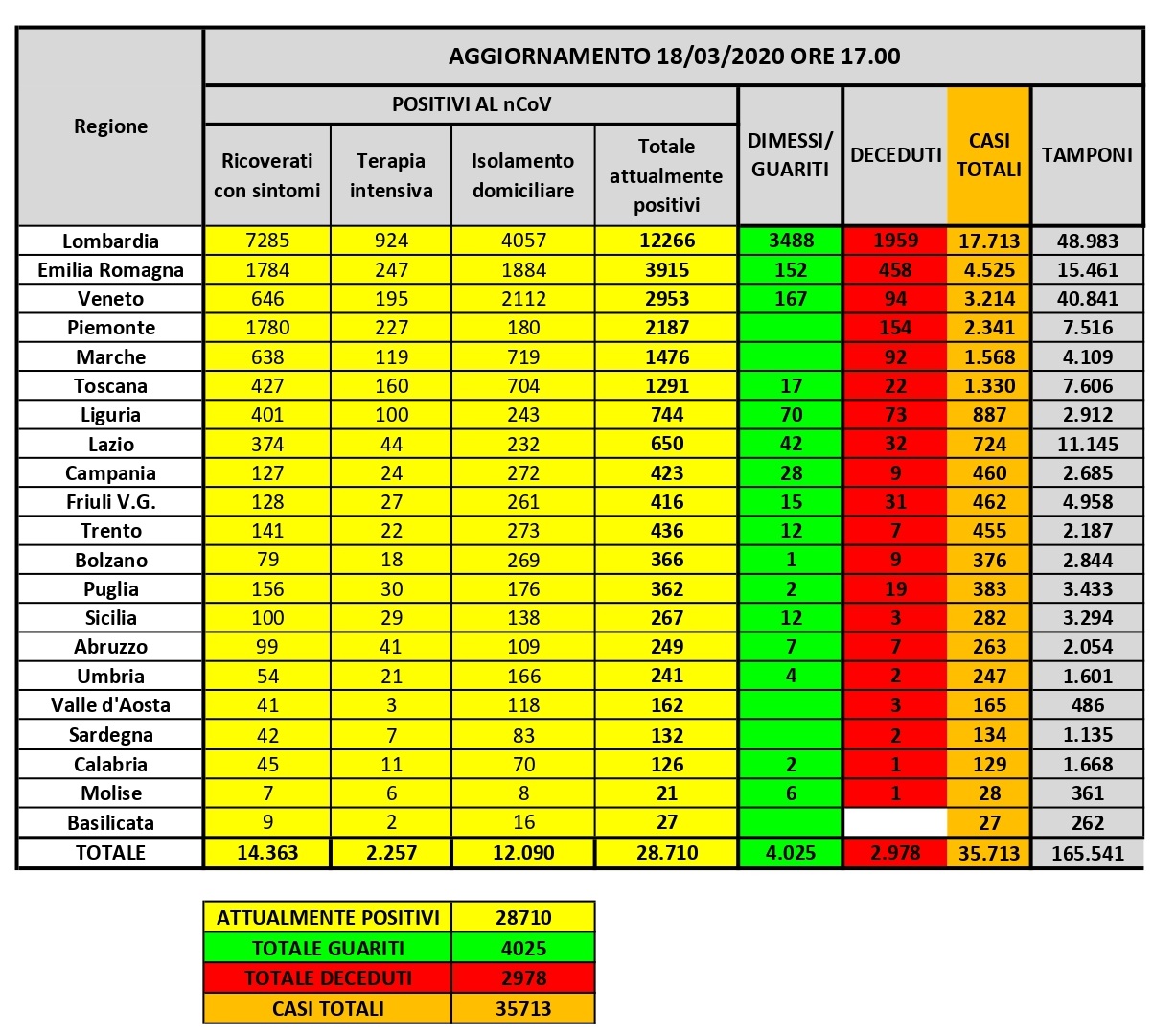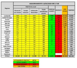 Nell’ambito del monitoraggio sanitario relativo alla diffusione del nuovo Coronavirus sul territorio nazionale i casi totali sono 35.713, al momento sono 28.710 le persone che risultano positive al virus.