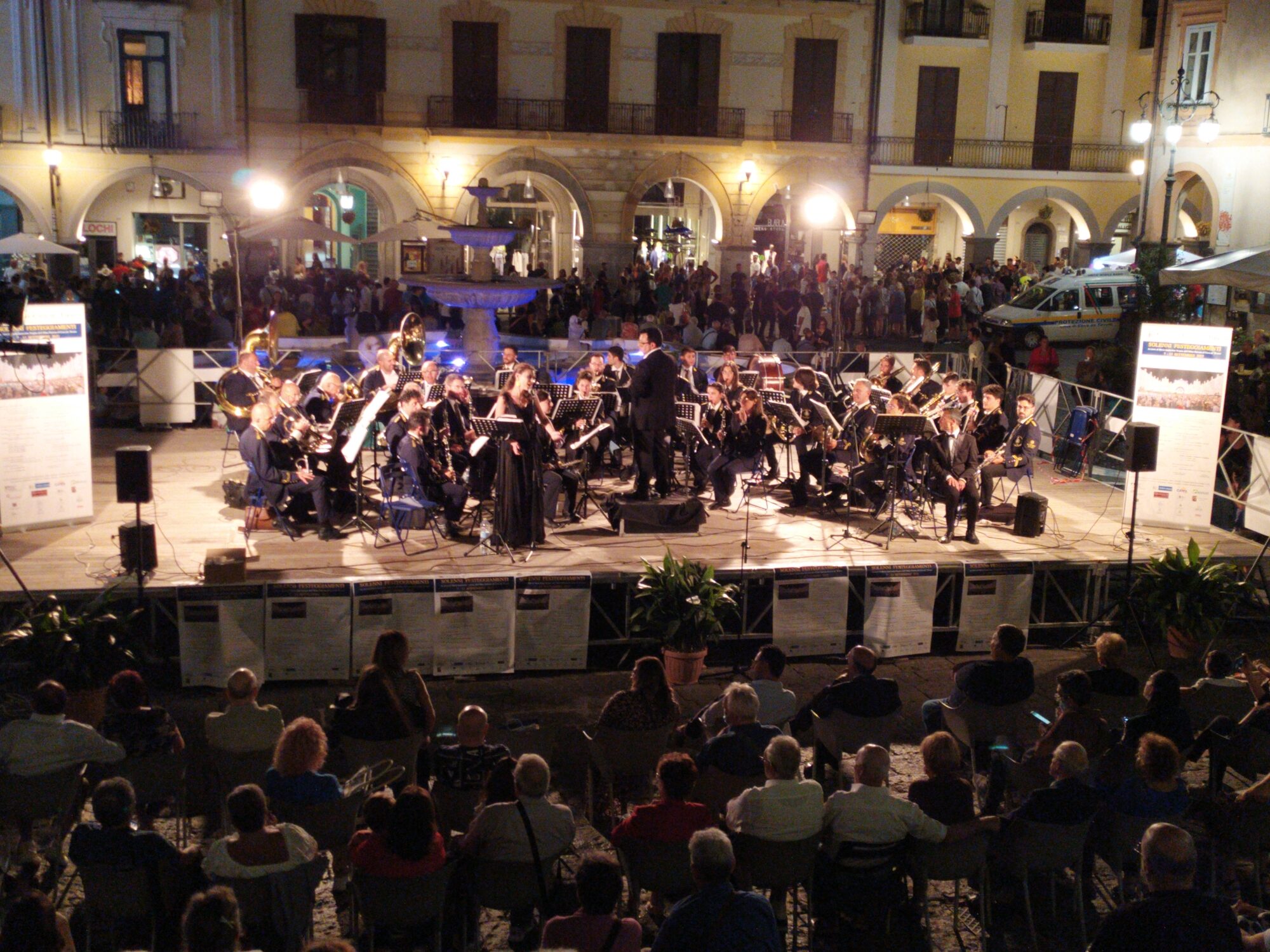 Il problema, però, è che il concerto è stato continuamente disturbato da musiche e frastuoni che si accavallavano, e che provenivano non tanto dai vari gruppetti di ragazzini, o anche adulti, che discorrevano tra loro, ma da gruppi organizzati di danzatori con “tammorre”, sbandieratori con codazzo di tamburi, mi sembra di aver sentito pure qualche gruppo di Trombonieri, che percorrevano il corso porticato verso Piazza San Francesco, strombazzando a più non posso, senza che nessuno li avesse avvertiti che dalle ore 21,00, inizio del concerto, non avrebbe dovuto fiatare neanche una mosca.