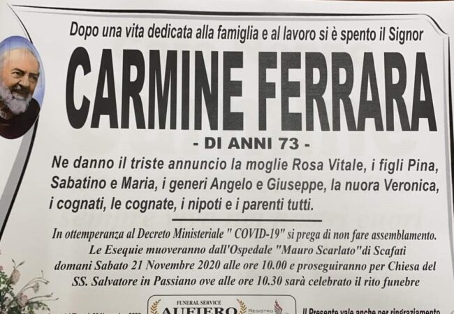 73 anni, in pensione da alcuni anni, Carmine Ferrara è stato dipendente del Comune di Cava de’ Tirreni, dove era molto conosciuto ed apprezzato per la serietà e la competenza quale elettricista.