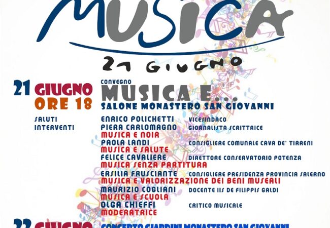 Giovedì 21 giugno, alle ore 18.00, nel salone del Monastero di San Giovanni si svolgerà il convegno “MUSICA E…” sul ruolo della musica nella vita quotidiana e i suoi effetti nel sociale.