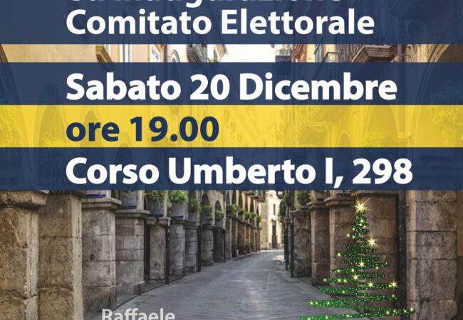 Sabato 20 dicembre si terrà il brindisi di auguri e l’inaugurazione ufficiale del Comitato Elettorale di Raffaele Giordano Sindaco, primo momento pubblico di incontro con cittadini e sostenitori in vista delle prossime elezioni amministrative