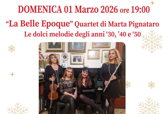 Domani domenica 1° marzo alle ore 19.00 presso l’Aula Consiliare del Comune di Cava de’ Tirreni si terrà il concerto “La Belle Epoque” Quartet di Marta Pignataro che suonerà le dolci melodie degli anni ’30- ’40- ’50 con musiche di Édith Piaf, Alessandro Sopranzi, Giovanni D’Anzi, Andrea Bixio, Consuelo Velázquez.