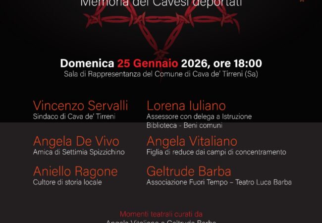 L’evento, a cura di Geltrude Barba, Aniello Ragone e Giuseppe Cardamone, è in collaborazione con il Comune di Cava de’ Tirreni. Si parlerà di alcuni cavesi che furono deportati nei campi di concentramento nazisti; non tutti tornarono a casa.